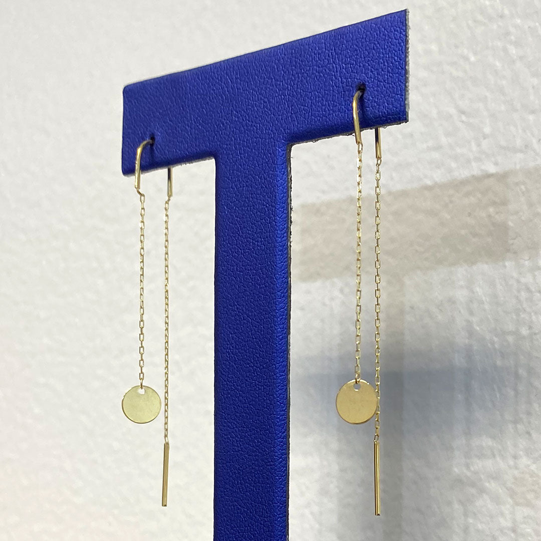14k Dainty Needle & Thread Dangle Earrings with Circle Charm$125.00