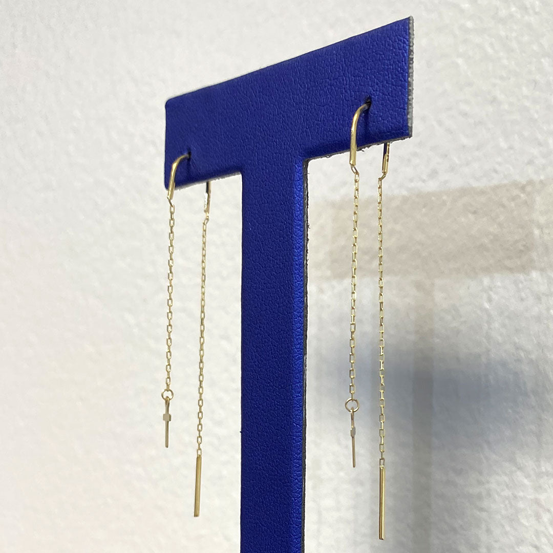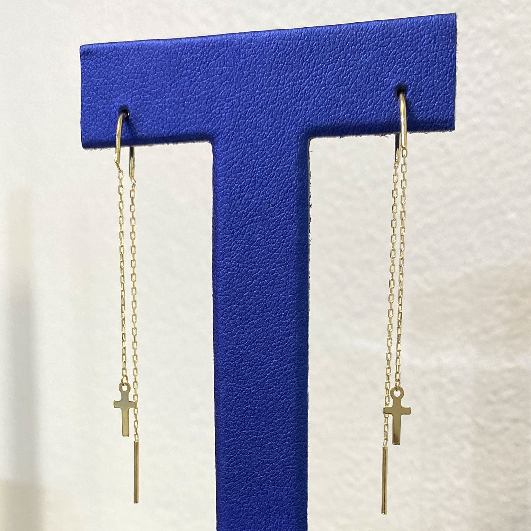 14k Dainty Needle & Thread Dangle Earrings with Cross Charm$125.00