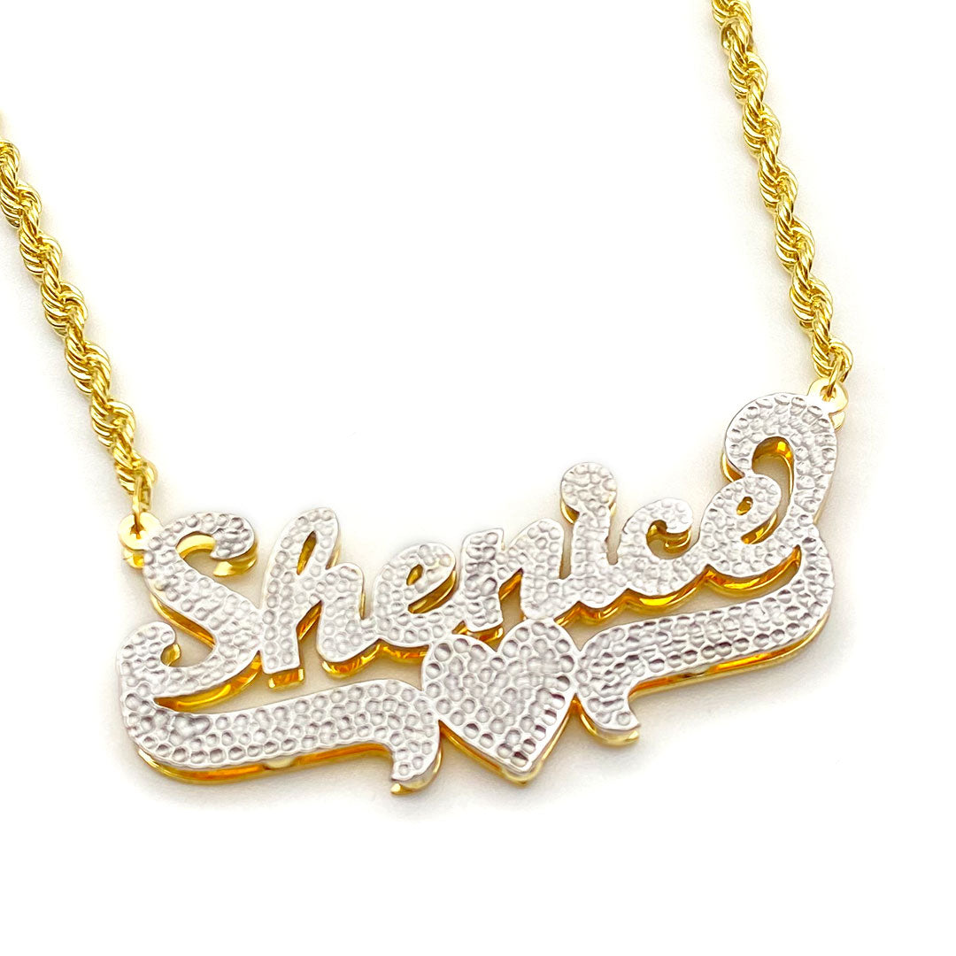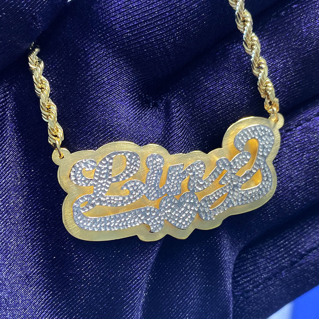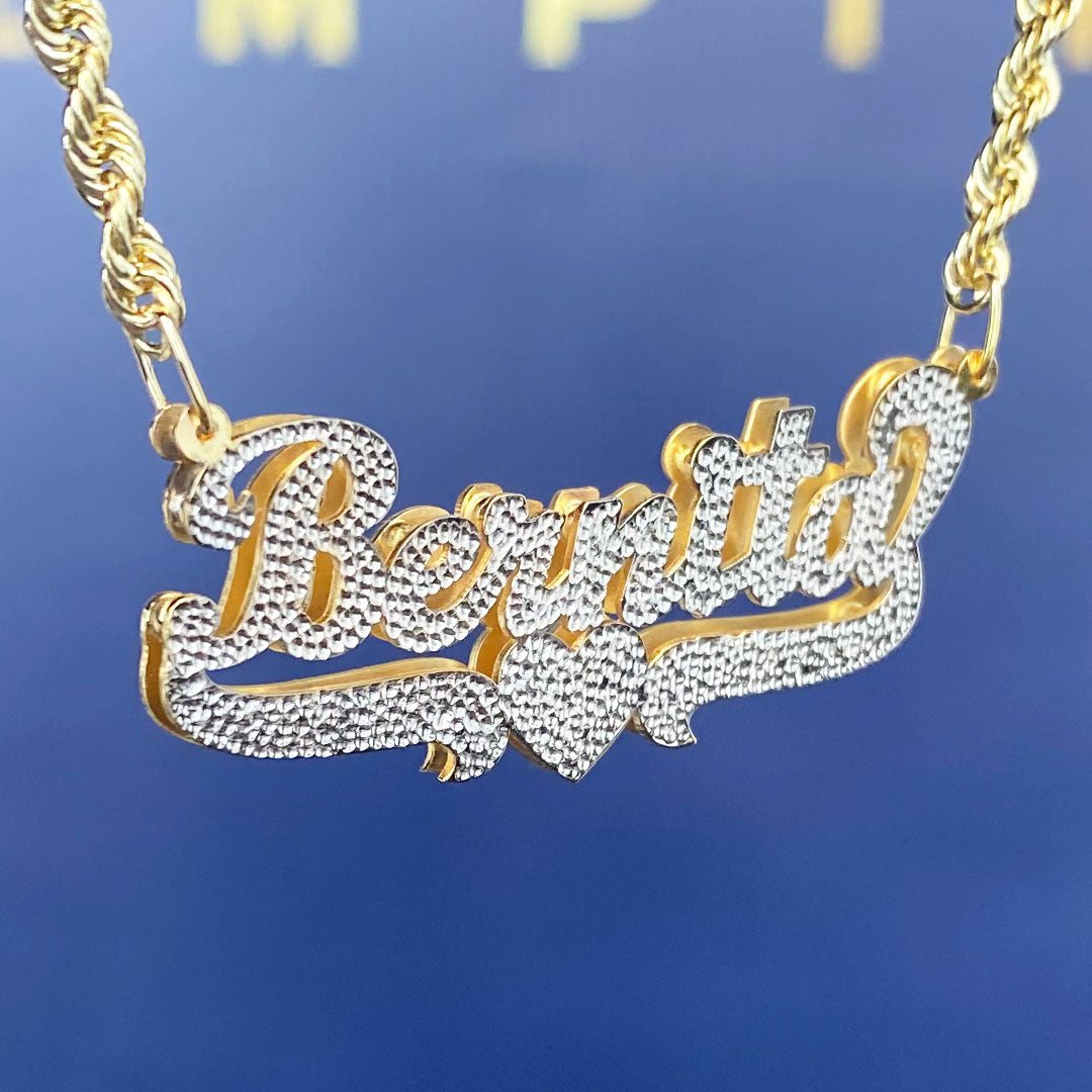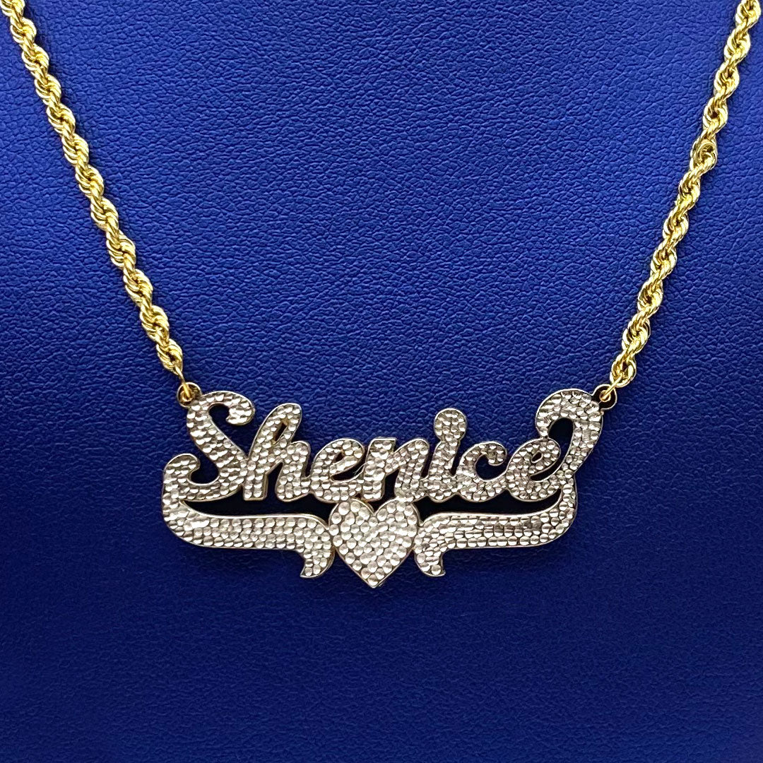 Personalized Diamond Cut Cursive Double Name Plate Pendant with Heart Underline